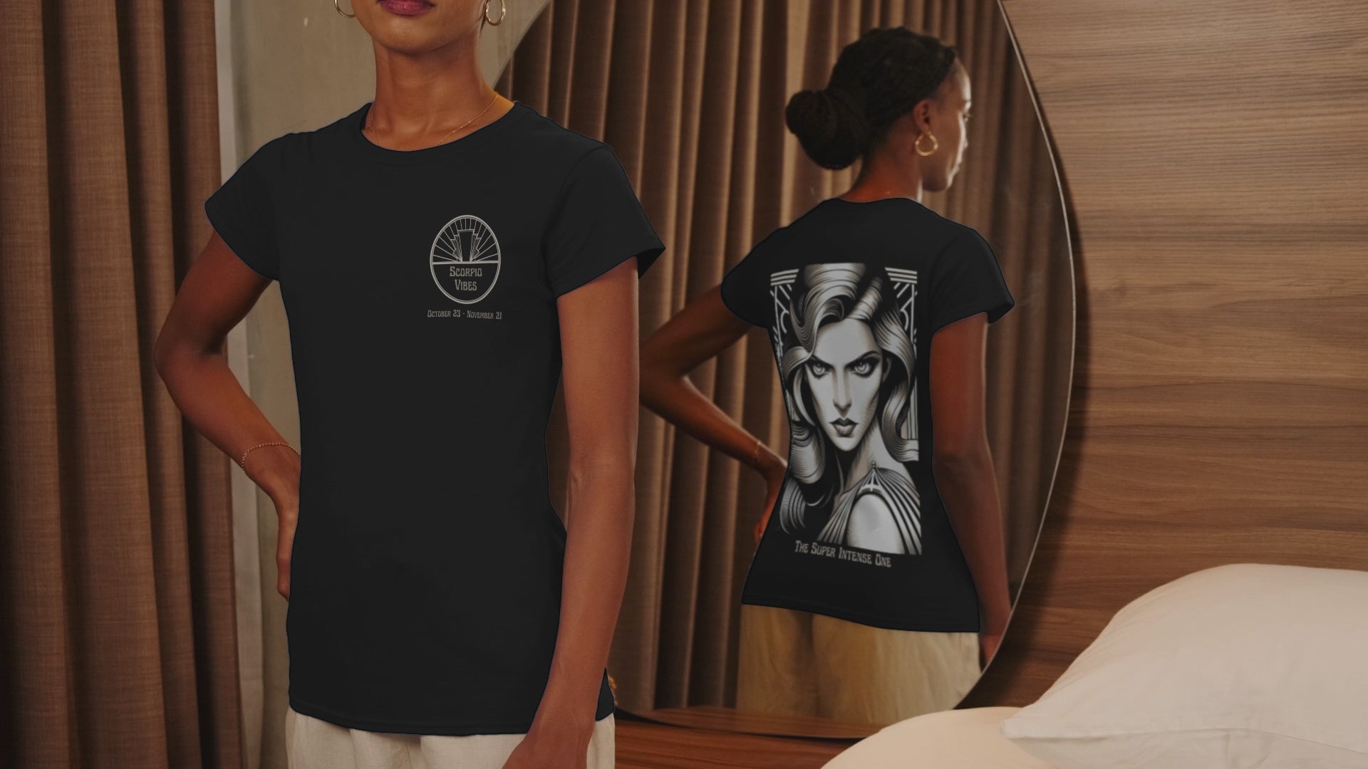 Embrace the depth of Scorpio's intensity with our 'Scorpio Depths' Tee, crafted in the distinctive midcentury style that elegantly captures the essence of this enigmatic water sign. This T-shirt features a design that mirrors the Scorpio's profound and passionate nature. At the center, a striking woman acts as a powerful representative of the Scorpio's fierce and magnetic personality. Made from high-quality materials, this tee offers not only style but also superior comfort and durability, perfect for those who live intensely and love fiercely. Wear it as a statement of your powerful presence and mysterious allure.